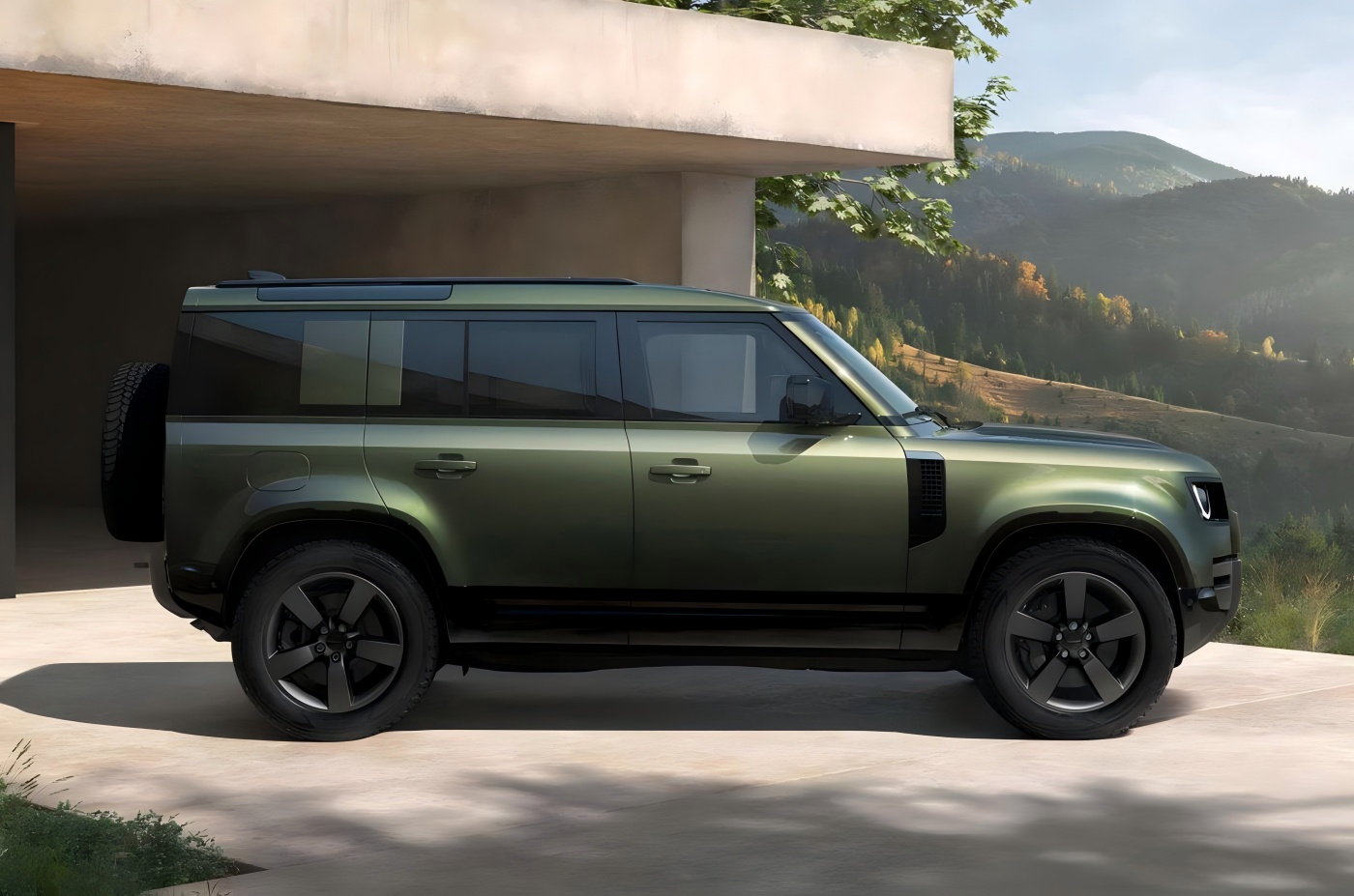 جانب. المنظر من الجانب، تواصل السيارة الجديدة التصميم الكلاسيكي لسيارة لاند روفر ديفندر. يعتمد الإصدار 110 على تصميم بأربعة أبواب، ويتميز برفارف جانبية أمامية وخلفية واسعة، إلى جانب عجلات بخمسة أذرع ومساميك مكابح متعددة المكابس. وتبقى أبعاد الجسم دون تغيير، حيث يبلغ الطول والعرض والارتفاع 5018/2105/1967 ملم على التوالي، وقاعدة العجلات 3022 ملم.